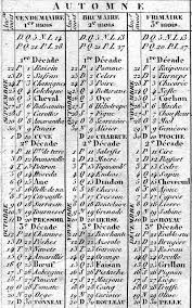 En el calendario republicano, los años siempre empezaban en el equinoccio de otoño, tenía 12 meses de 30 días cada uno. Los meses se dividen en tres décadas de 10 días (desaparecen las semanas). No coinciden exactamente con los meses del Calendario Gregoriano, al empezar siempre la cuenta de los meses con el inicio astronómico de las Estaciones. Los nombres de los meses adoptan denominaciones de fenómenos naturales y de la agricultura (Brumario, Ventoso, Floreal, etc) y los días del año, en vez de asociarse a un santo, se asociaban a una planta, herramienta o animal(así, por ejemplo, el día 15 del mes Floréal estaba dedicado al gusano de seda). Los cinco días que quedaban para completar el año astronómico (inicialmente “les jours sans-culottides”, luego “jours complémentaries”) eran fiestas nacionales.